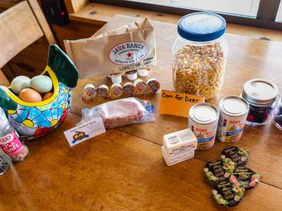 The breakfast items are there for you to prepare and enjoy at your leisure. The farm fresh eggs, the Canadian Bacon from our local OPA's German Smokehouse, along with fresh fruit and biscuit dough to bake with honey, jam, and butter to top the biscuits hot outta the oven.
